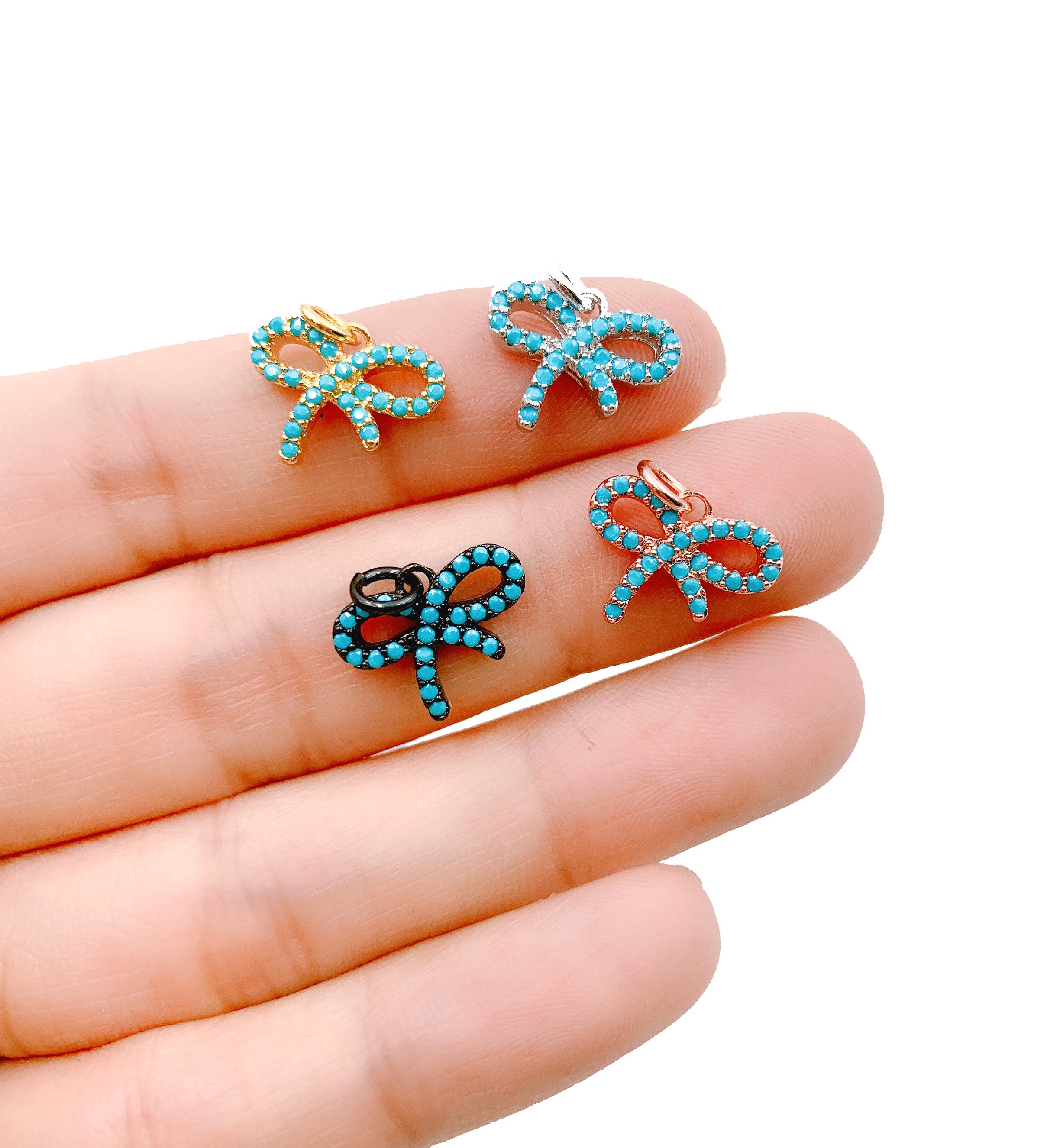 18K Gold Filled Pave Ribbon Charm with Turquoise CZ, Micro Pave CZ Ribbon Knot Charm